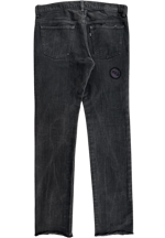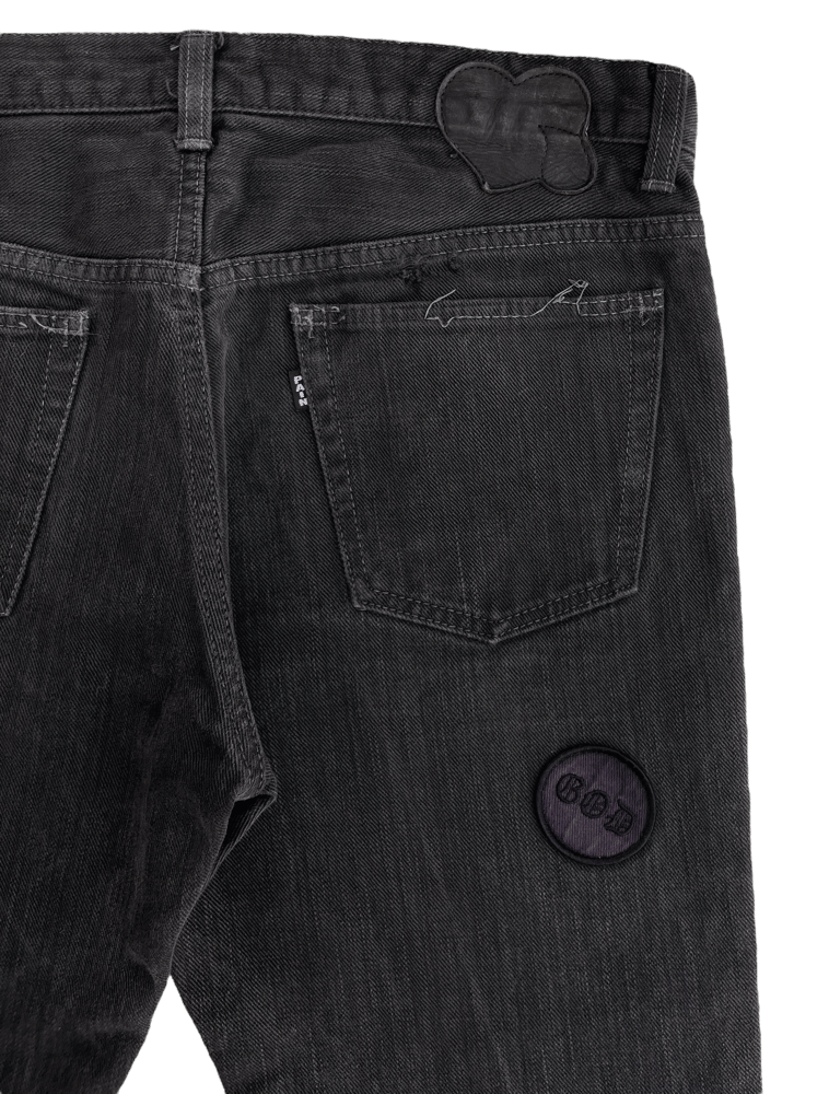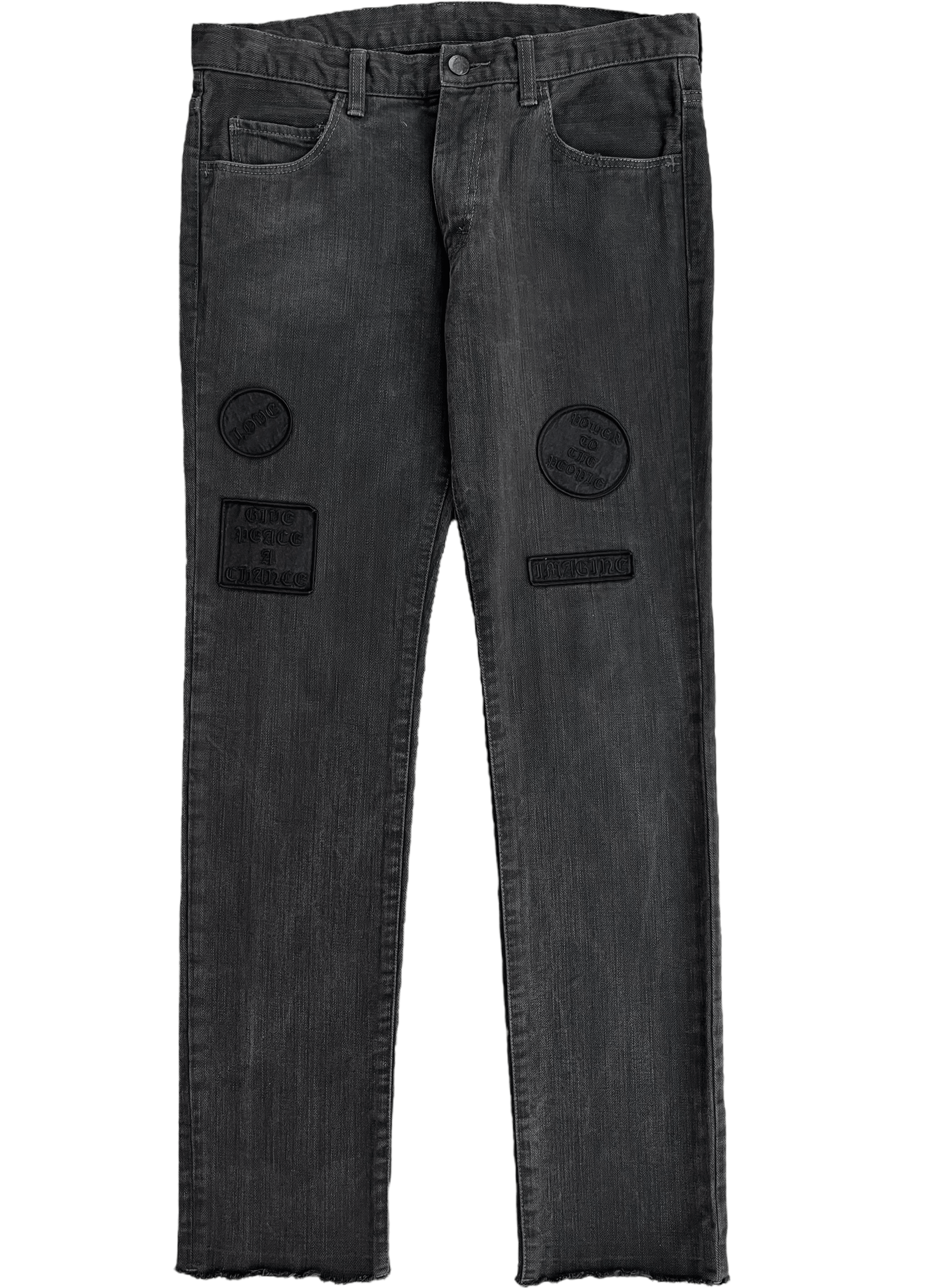 These charcoal wash jeans, from A/W 2004 "Give Peace a Chance" collection, feature black on black embroidered patches throughout. Additionally, the skinny cut bottoms have raw hems and Number (N)ine's signature crying heart waist tag patch in black leather.