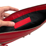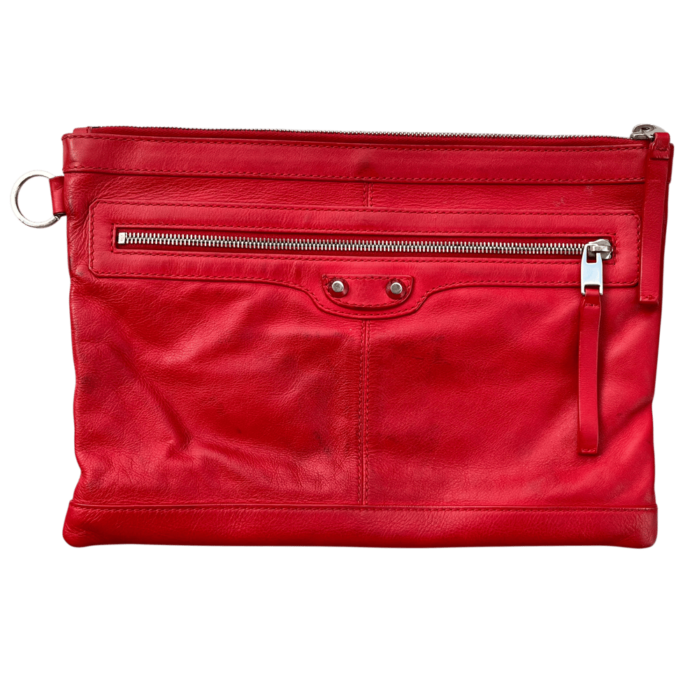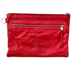 This soft red leather clutch features 2 zipper compartments with classic city bag hardware as well as a key ring.