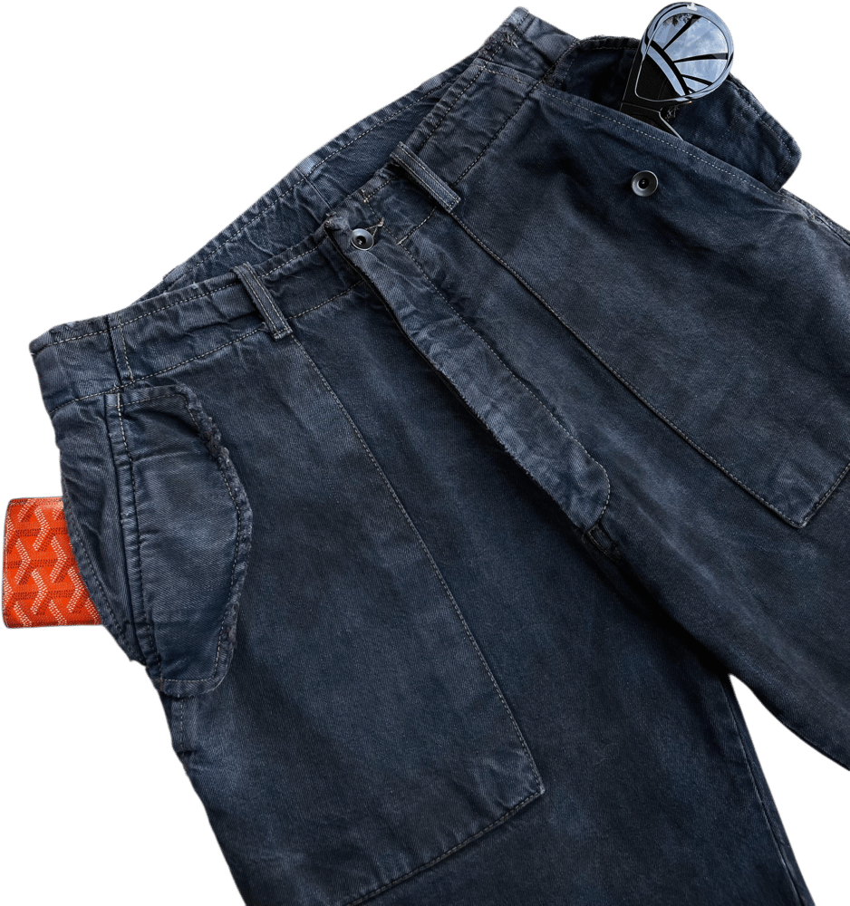 These deep indigo cotton denim shorts are from the early 2000's. The cargo bottoms features a unique mud wash throughout, double front pockets, extra deep back pockets, and released hems. Very Rare.