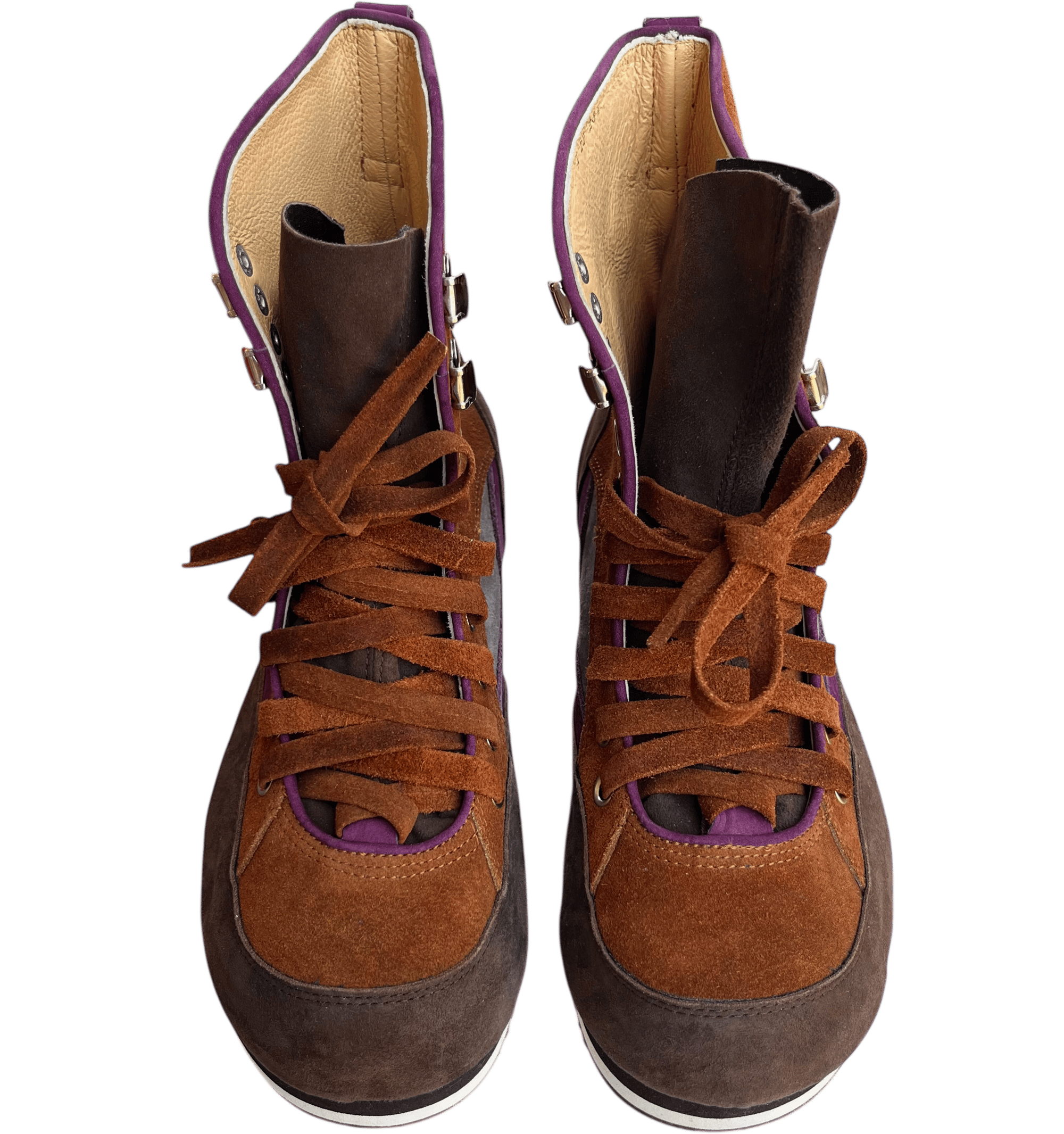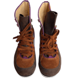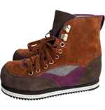 These chunky snow style boots feature premium suede upper in various colored panels. Additionally, they have matching leather laces and a layered foam & rubber sole. From 2003.